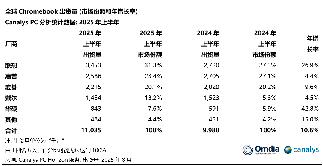 Canalys(现并入Omdia)数据显示,2025年第二季度全球平板电脑出货量达到3900万台,同比增长9%,环比增长5%。这一强劲表现主要得益于中国和EMEA(欧洲、中东和非洲)地区的稳定需求。与此同时,Chromebook市场表现亮眼,受益于日本GIGA学校项目推动下的教育设备更新,2025年上半年出货量达到1100万台。除了日本,多个市场的公共部门也在为教育设备提供资金支持,预计将持续推动Chromebook出货量在2025年及以后保持高位。