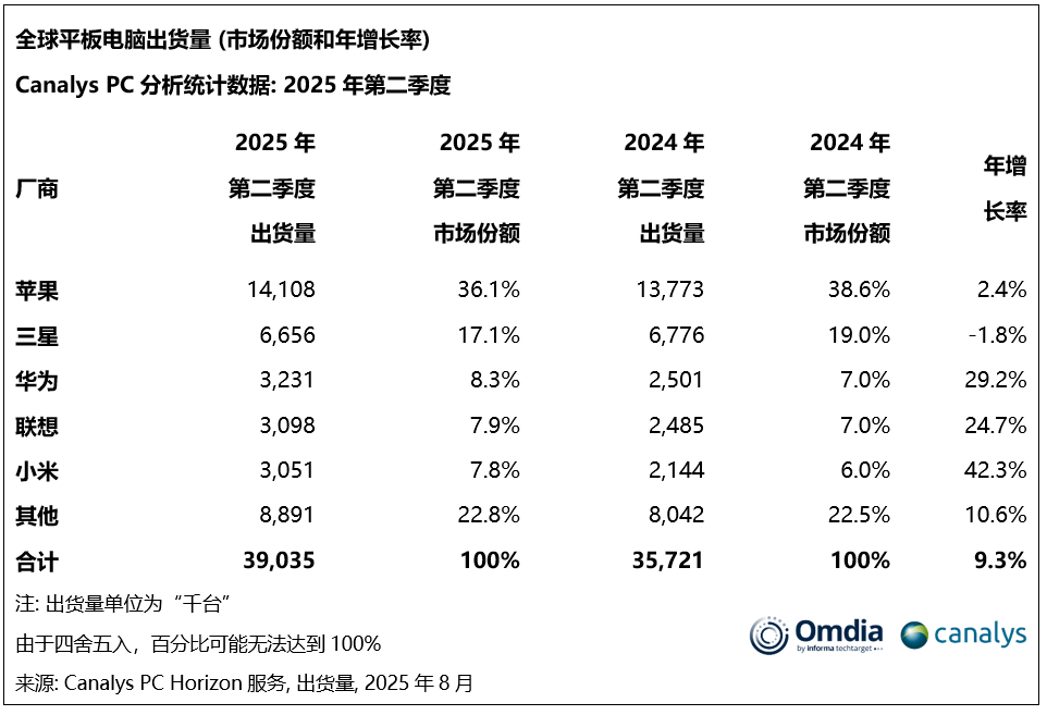 Canalys:2025年第二季度全球平板电脑出货量达到3900万台 同比增长9%