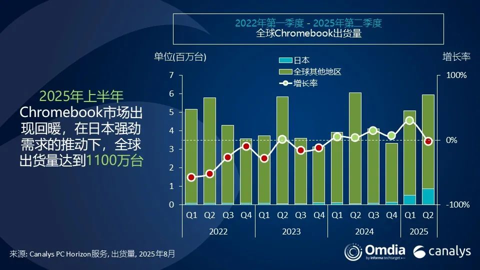 Canalys(现并入Omdia)研究经理 Kieren Jessop 表示:“在日本GIGA学校项目持续推进设备更新的带动下,Chromebook市场正迎来复苏期。受政府资助采购活动逐步加速的影响,发往日本的出货量同比增长超过20倍。预计这一需求高峰将持续至2026年年中。